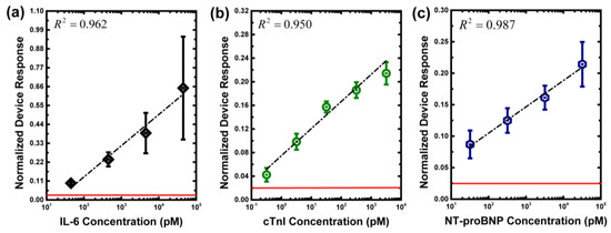 Experimental results of three biomarkers in PBS buffers. (a) IL-6; (b) cTnI; (c) NT-proBNP. The red line marks the noise level.