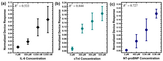 Experimental results of the three biomarkers in human serums. (a) IL-6; (b) cTnI; (c) NT-proBNP. In these plots, the x-axis represents the result measured by ELISA, and the y-axis represents the result measured by CMOS biosensors (n = 3). It should be noted that, to make the plot directly comparable to the clinical-sample ELISA read-out, the x-axis is not to scale.