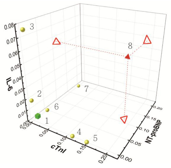 In Figure 5, each unit of the axes is NDR, which is the readout of the developed biosensing chip. Nos. 1–8 corresponds to Subject Nos. 1–8 shown in Table 1. No. 1 is the healthy control, No. 2 and No. 3 are patients with coronary artery disease, No. 4 and No. 5 are patients with myocardial infarction, and No. 6 and No. 7 are patients with congestive heart failure. No. 8 is the patient with coronary artery disease, myocardial infarction, and congestive heart failure. After the serum biomarkers were measured with our integrated CMOS biomolecular sensor and projected onto the “IL-6, cTnI, NT-proBNP” 3D map, we could easily and quickly differentiate the cardiac stages of subjects. This panel test thus can help doctors interpret a patient’s cardiac condition and provide treatment within a short period of time. The green cube represents the NDR of normal serum (Patient 1). The yellow spherical represents the NDR of a single heart disease (Patients 2–7). The red triangle cone represents the NDR of three heart diseases (Patient 8). The projected hollow triangles present the concentration in each biomarker.