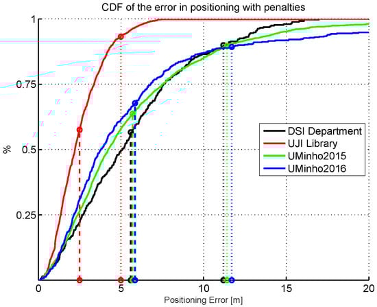 Wi-Fi fingerprinting assumes that all fingerprints, and therefore the corresponding RSSI values, are similar at a given point over time. Typical mean positioning errors are in the range of a few meters [], which is enough for pedestrian indoor positioning and navigation in most of the cases. The observed mean error highly depends on the matching algorithm used and the scenario. Heterogeneity of hardware, density and distribution of calibration and operational points, density and distribution of APs, and the materials present in the environment, among many other factors, affect the mean positioning error. The consequence is that the same indoor positioning algorithm might report different accuracies in different areas []. However, unexpected and unacceptably large positioning errors are often observed in working systems deployed in real environments, even when the mean positioning error is low, as depicted in the examples shown in Figure 1. Figure 1 shows the Cumulative Distribution Function (CDF) for 1 kNN-based IPS using a database collected at the DSI department (Univeristy of Minho, Guimarães, Portugal), a Library area (Universitat Jaume I, Castellón, Spain) and the UMinho systems that participated in the 2015 and 2016 IPIN competitions [,]. In all cases, the percentage of operational fingerprints that are reporting a positioning error higher than twice the average error is significant (higher than 10% approx).