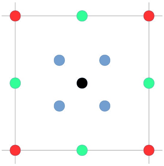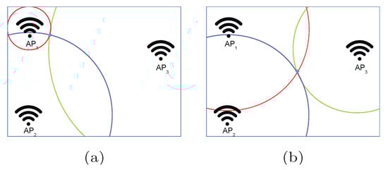 The Wi-Fi signal is an electromagnetic wave whose intensity is attenuated as it propagates through space. In the optimal case, where the signal is not affected by any external interference, the free space path loss model (see Equation (1)) can be used to calculate the signal attenuation in an optimistic world or scenario. In order to overcome the omnidirectional propagation of the radio signal, multiple APs are used to obtain accurate positioning in 2D and 3D environments as shown in Figure 2, where two naïve examples for three APs are shown. Circles have been used to represent the places where a particular RSSI value is detected for a given AP (red circle for , blue circle for and green circle for ). In the first example, the operational fingerprint represents a case where , whereas the RSSI values are similar () in the second example. In the two examples, a “perfect” unique positioning estimation is provided in the intersection of the three circles.