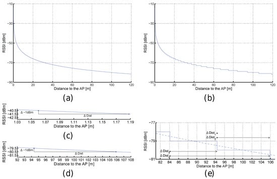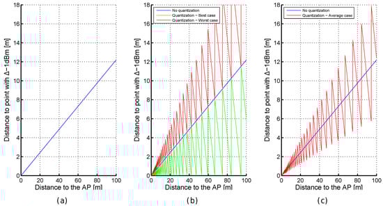 RSSI values are more representative when they are close to the emitter in the optimistic world with neither quantization nor noise; e.g., a decrease of just 1 dBm corresponds to a displacement of ≈13 cm (from −40.5 dBm to −41.5 dBm) but it is ≈11.5 m (from −79.5 dBm to −80.5 dBm) according to Figure 3c,d, respectively. This increment of distance, associated with a decrease of 1 dBm, linearly depends on the distance to the AP as can be seen in Figure 4a.
