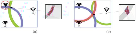 The uncertainty introduced by the quantization of RSSI values and the omnidirectional signal propagation are partially overcome by the use of RSSI values from multiple APs. Figure 5 shows two naïve examples of fingerprinting for three APs. Rings have been used to represent the area where a particular RSSI value is detected for a given AP since quantization is present (red ring for , blue ring for and green ring for ).