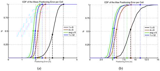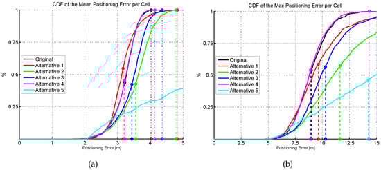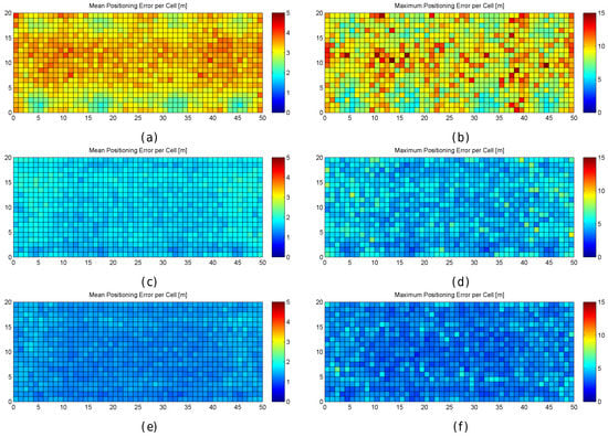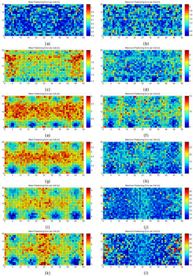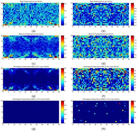 For the optimistic world, Figure 6a shows that the mean positioning error is comprised of between 0.35 m and 0.4 m in most of the cells. Only a few cells, located near the corners, provide higher mean positioning errors of around 0.5 m. Similarly, the maximum positioning error per cell (Figure 6c) is comprised of between 0.6 m and 0.75 m in most of the cases. The maximum values (above 1 m) are reached near the corners. Also, the percentage of cases where the error was higher than 0.707 m (Figure 6e) is notably higher in the cells located near the corners with a percentage close to 25%, whereas it is lower than 5% in the rest of the cells. In the optimistic world, the error is never higher than twice the MEE (Figure 6g).