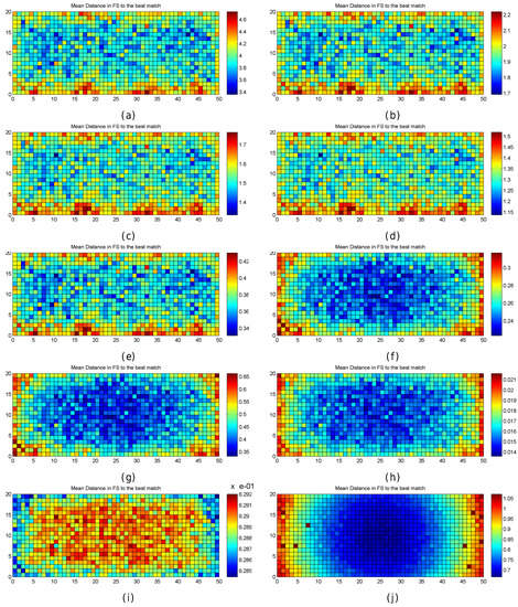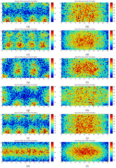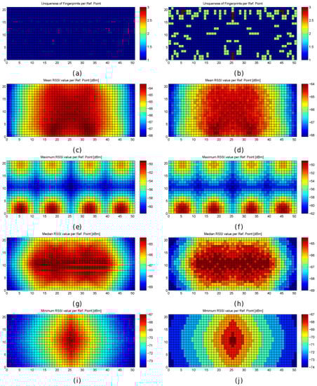 RSSI and fingerprint statistics in the optimistic world (left images) and quantized world (right images). (a,b) uniqueness of reference fingerprints; (c,d) mean RSSI value of reference fingerprints; (e,f) maximum RSSI value of reference fingerprints; (g,h) median RSSI value of reference fingerprints; (i,j) minimum RSSI value of reference fingerprints.
