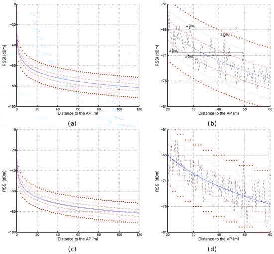 Figure 8 shows some examples of the RSSI according to the distance to the AP using the path loss with Gaussian noise (). In particular, Figure 8a shows the signal strength calculated with the path loss model (blue line) plus the bounds corresponding to the 68–95–99 rule (i.e., the 68.27%, 95.45% and 99.73% of noisy RSSI values fall within the first, second and third bounds respectively). Similarly, Figure 8c shows the path loss equation when noise is present () and the RSSI values are quantized.