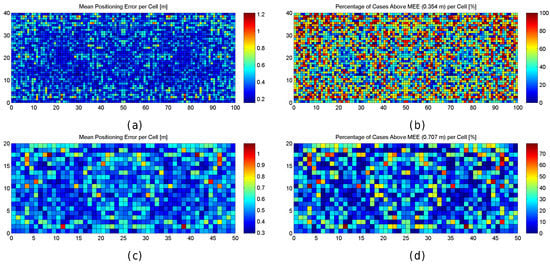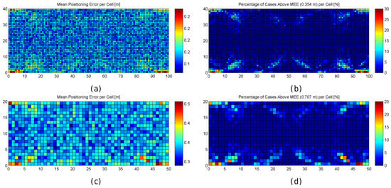In order to better analyse where the large error occurs, Figure 9 graphically shows the mean positioning error per grid cell and the percentage of cases where the positioning error was higher than the maximum expected error; only the 0.5 m and 1 m grid have been considered.