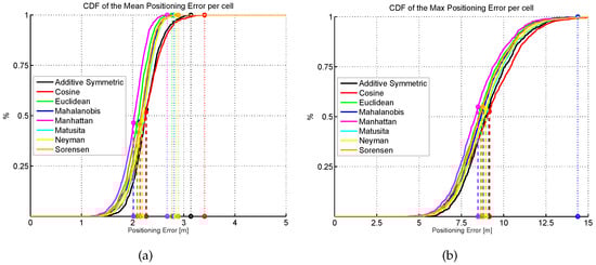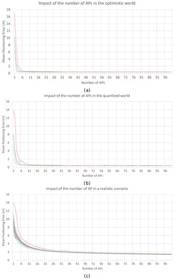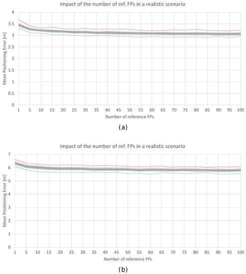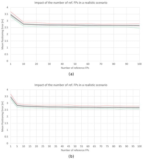 Farshan et al. [] took a microscopic look at Wi-Fi fingerprinting using smartphones. They firstly introduced seven definitions to improve the matching process at the operational stage using a deterministic approach (e.g., Radar [,]) and a probabilistic-based approach (e.g., Horus [,]). Three different distance metrics were considered in the former approach and two well-known distributions for RSSI modelling were used in the latter. The results showed that the combination of fingerprint definition and estimation algorithm that yields the best positioning accuracy highly depends on the environment and even on the floor for a given large environment. Moreover, they analysed the impact of frequency band on fingerprinting. The RSSI is more stable for the 5 GHz band, which enables the IPS to provide better positioning accuracy. The 5 GHz band is less affected by temporal signal variations due to people movement because the probes are sent at a higher bit-rate than the 2.4 GHz band probes. Also, the low variability is also due to the low co-channel interference in the 5 GHz band. Finally, the presence of Virtual APs (physical devices emitting multiple Wi-Fi networks) also reduces the positioning error because the AP density increases, which seems to have a positive correlation with accuracy, and the temporal variability inherent to wireless signal propagation is better captured. All results were provided as CDFs but they were truncated to errors of up to 10 m (large errors were omitted).