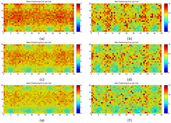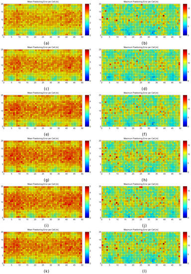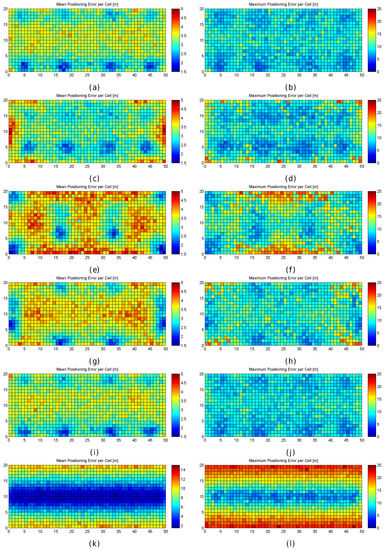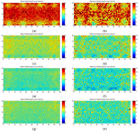 When quantization is introduced, the mean positioning error per cell (Figure 6b) increases with respect to the optimistic world, and the locations of high values are more scattered (Figure 6d). This is also the case for the maximum positioning error per cell and the percentage of cases where the error has been higher than 0.707 m (Figure 6f). Positioning errors higher than 1.414 (twice the maximum expected error) appear and the percentage of these errors is between 25% and 40% (Figure 6h) in some cells.