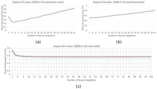 Table 2 shows the accuracy of the 1-NN algorithm in the optimistic world (no quantization and no noise) and in the quantized world (no noise). The mean error corresponds to the average of the mean positioning error over the 100 repetitions, the maximum error corresponds to the average of the maximum positioning error over the 100 repetitions, the percentage of cases above the Maximum Expected Error (MEE) corresponds to the number of operational fingerprints whose error was higher than the MEE. Assuming that the 1-NN algorithm returns the best match, the MEE should never be higher than 0.707 m () for the 1 m grid. This distance corresponds to the highest distance between an operational point and its best match (closest fingerprint in the real-world space).