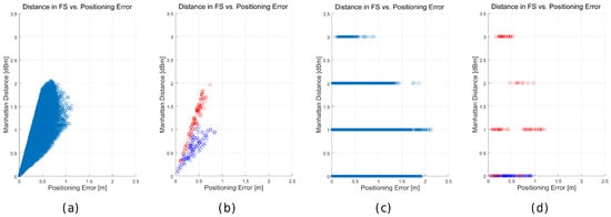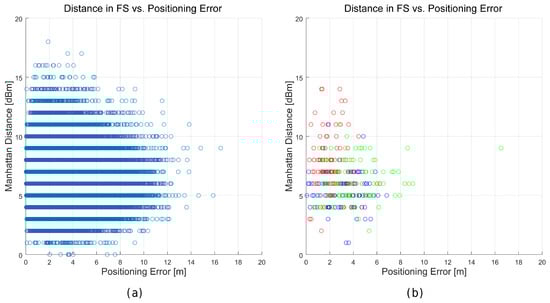 Dempster et al. [] introduced an analysis of RSSI variance, where it was shown that the user’s orientation at a reference point influences the RSSI value captured by a device. Averaging fingerprints just for position (i.e., the measurements taken at the same reference point without considering the user’s orientation) had higher variance than averaging the fingerprints per position and orientation, so averaging by position and orientation was more discriminative. Moreover, this paper concluded that the relationship between the real and RSSI distances of two fingerprints was poor. Comparing fingerprints with a not totally well-suited distance metric was suggested to be one of the reasons for positioning error. Finally, the authors highlighted that the physical underpinning might be easily ignored in dBm-based fingerprinting, being the RSSI values wrongly treated as unitless numbers.