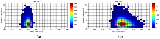 According to the figures, it seems that the maximum RSSI better represents the upper bound in error positioning in the simulated scenario. On the one hand, the lower the maximum RSSI value, the higher the positioning error that can be obtained. On the other hand, the higher the maximum RSSI value, the more the probability of having a large error decreases. Furthermore, the largest error is lower than 5 m when the max. RSSI is −43 dBm.