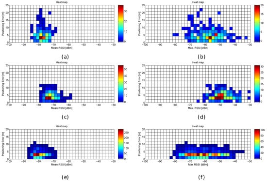 Relation between positioning error and RSSI statistics (mean RSSI and maximum RSSI value) in real scenarios. (a,b) Departamento de Sistemas de Informação, University of Minho; (c,d) GEOTEC laboratory, Universitat Jaume I [] (e,f) Library, Universitat Jaume I [].
