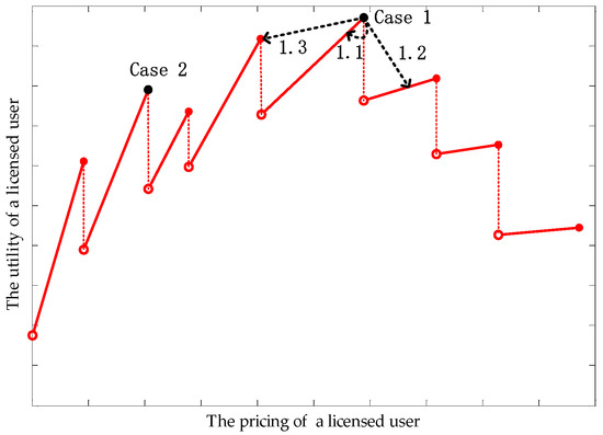 - Single unlicensed user is dishonest: Located on the straight line with maximal utility; if they become dishonest, as shown in Figure 5, case 1.1, case 1.2, or case 1.3 will occur.
