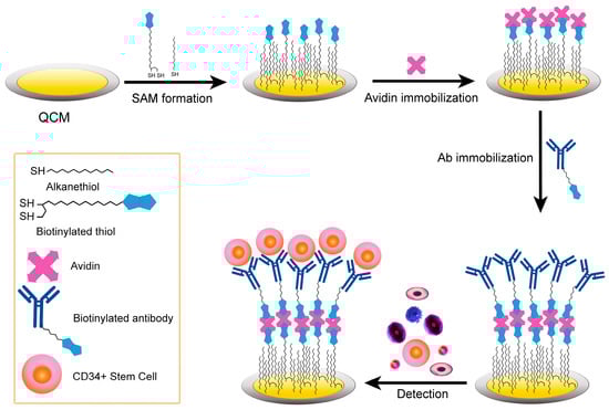 Schematic illustration of the quartz crystal microbalance (QCM) immunosensor for the detection of CD34+ stem cells.