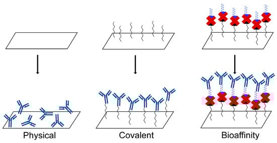 A key aspect of this system is the surface modification of the QCM with antibodies targeting to a specific stem cell marker, the CD34 antigen. Sensitive and reproducible biosensor surfaces need the immobilization of active biomolecules with a controllable and homogeneous orientation, thus retaining their biological activity [48,49,50,51]. This aspect is crucial to antibodies: once immobilized onto a solid support, they could partially lose their specific binding competence, if they are randomly oriented on the surface. To attain ultimate selectivity as well as sensitivity for immunosensing, highly oriented antibody molecular layers on the solid support surfaces are required. Several immobilization techniques have been developed [48,49,50,51], though only three are the most common: physical, covalent, and bioaffinity immobilization (Figure 2).