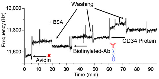 After antibody immobilization, a solution of His-tagged-CD34 protein (20 µL, 25 μg/mL) was added and a frequency shift of 60 Hz was observed. These results confirmed the specificity of the avidin/biotinylated Ab system and the possibility to use this system to detect stem cells.