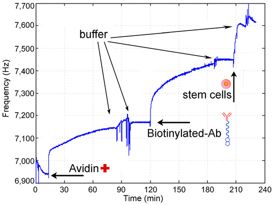 A typical assay for stem cells detection consisted of the same steps reported in Section 3.2, with the differences that a mixture of cells, instead of His-tagged-CD34 protein, was added to the QCM-immunosensor in the last step. The assay steps can be summarized as follows: (1) frequency measurement of the biotin-functionalized quartz crystal; (2) measurement of frequency shift after avidin addition; (3) measurement of frequency shift after anti-CD34 biotinylated antibody binding; (4) measurement of frequency shift upon stem cell sample addition. The frequency shift observed in each step of the assay is reported in Figure 6.