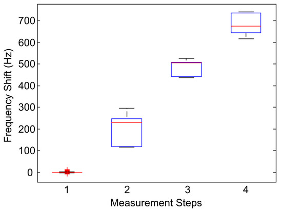 Statistical populations are shown in Figure 7 using a box plot to display variation for each data set. Average frequency shift values obtained from the three independent replicas are reported in Table 2.