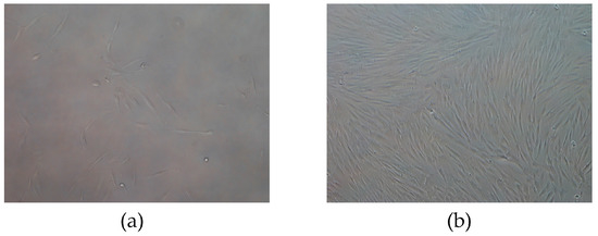 (a) Cells after 24 h of culture (original magnification × 100). (b) Cells at confluence after 1 week of culture (original magnification × 100).