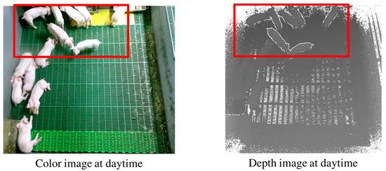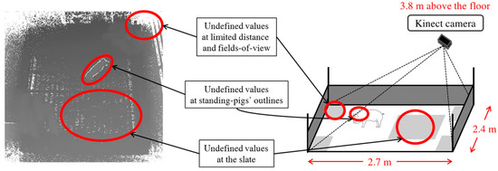 - Standing-pigs are detected at night (i.e., with a light turned off) with a low-cost depth camera. It is well known that most pigs sleep at night [44,45,46]. For the purpose of 24 h individual pig tracking, we only need to detect standing-pigs (i.e., we do not need to detect the majority of lying-pigs at night). Recently, low-cost depth cameras, such as Microsoft Kinect, have been released, and thus we can detect standing-pigs using depth information. However, the size of a 20-kg weaning pig is much smaller than that of a 100-kg adult pig. Furthermore, the accuracy of the depth data measured from a topview Kinect degrades significantly, because there is a limited distance (e.g., a maximum range of 4.5 m) and field-of-view (e.g., horizontal degree of 70.6 and vertical degree of 60) in which depth values are covered. If we install a Kinect at 3.8 m above the floor to cover the entire area of a pen (i.e., ), thus minimizing the installation cost for a large-scale farm, then it is difficult to classify a weaning pig as standing or lying. To increase the accuracy, we consider the undefined depth values around standing-pigs.