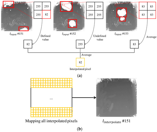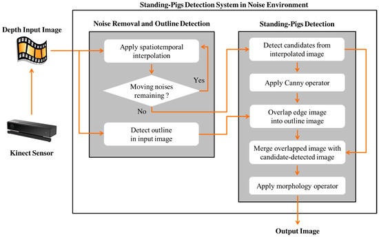 - A practical issue caused by moving noises is resolved. For example, in a commercial pig farm with a harsh environment (i.e., disturbances from dust and dirt), there are many moving noises (i.e., undefined depth values varying across frames) at night. Because these moving noises occlude pigs (i.e., even up to half of a scene can be occluded by moving noises), we need to recover the depth values that are occluded by the moving noises. Because we utilize the undefined depth values around standing-pigs to increase the detection accuracy, we need to classify undefined depth values as useful ones (i.e., caused by standing-pigs) and useless ones (i.e., caused by moving noises). We apply spatial and temporal interpolation techniques to reduce the moving noises. In addition, we combine the detection results of standing-pigs from the interpolated images and the undefined depth values around standing-pigs to detect standing-pigs more accurately.