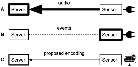 Three alternative implementations of the sensor grid approach for the monitoring of the acoustic environment: in (A) the raw audio is transmitted; in (B) only the detected events; and in (C) a compressed spectral representation. Thickness of arrows indicates bandwidth and thickness of boxes indicates the level of computation or storage required.