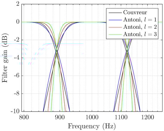 A common way to implement third-octave analysis is to first design the highest octave three filters, and use them on progressively time-decimated versions of the input signal []. Antoni [] presents an alternative analysis method based on direct frequency weighting, which yields a lower computational complexity as opposed to time filtering. The weights matrix design procedure complies with both ANSI S1.1-1986 [] and IEC 61260-1:2014 [] standards. It also meets the partition of unity principle over all frequency bins in the relevant range. Resulting filters for different parameter l values are compared with Couvreur’s implementation [] with 2nd order Butterworth time-domain filters, as shown in Figure 2. The major difference is that gains at cutoff frequencies are fixed at the optimal −3 dB value by design.