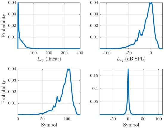 Considering an estimated PDF for our data, as shown in Figure 3 (top-left), immediately applying a linear quantization is clearly suboptimal, as the data mostly consist of very low values and a direct quantization results in most of the information being lost. We therefore flatten the PDF by taking the logarithm of the representation (top-right). This allows to better use the available range of symbols. A linear quantization is then applied with output values to obtain Figure 3 (bottom-left). Finally, we use a -encoding algorithm along the time dimension to reduce redundancies between consecutive frames. This effectively concentrates higher probabilities on symbols around zero (Figure 3 bottom-right), yielding a higher amount of symbols at but nevertheless a smaller entropy. In the example shown here, the entropy before -compression is which is reduced to .