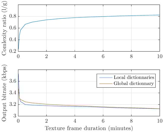 Huffman encoding is then computed with either a frame-specific symbol-code dictionary or a fixed dictionary generated using a learning dataset. A comparison of both methods is shown in Figure 4. For most short texture frame durations, the local Huffman algorithm is found to be much faster. In fact, the encoding computational complexity is a function of the number of dictionary elements. A frame-specific dictionary only contains the symbols found in a given data packet, while a fixed dictionary must contain every possible symbol as it does not depend on the present data. The output bitrate is found to be close for both methods, as sending an optimal local dictionary balances the suboptimality of globally generated symbol-code pairs.