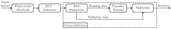 Classification process flowchart. Here third-octave bands are obtained by reversing the operations in Section 2.3 and cepstral coefficients are computed before training the model. Cross-validation is achieved by independantly training and testing the models with each of the 10 combinations of a 90–10% training–validation dataset separation.