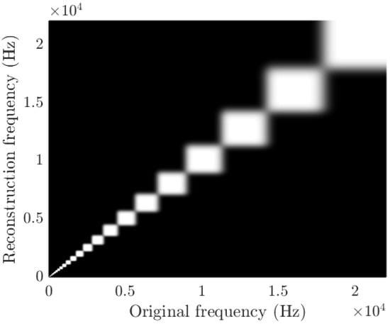 This test requires an implementation of the inverse operation of the coding process to provide the listener with an estimate of the time-domain signal. To do so, a linearly-scaled spectrogram from the band-focused representations is estimated. This estimation is achieved by multiplying the spectral representation by the scaled transpose of the forward transformation matrix. A loss of resolution increasing with frequency is induced due to the shape of the transformation, as illustrated by Figure 7. Each white square can be interpreted as the filter applied to obtain a single third-octave band. The filtering process will average the energy content of the signal over the corresponding band. As a result the energy located at a specific frequency is impossible to recover and the best inverse approximation is to split the third-octave band’s observed energy into all the corresponding frequency bins with the same proportions as during analysis. This leads to the phenomenon seen in Figure 7 where part of the energy of a frequency bin in the original signal is found in all other bins of the same band at reconstruction, in almost equal proportions. The signal phase is recovered with the Griffin–Lim algorithm [] if analysis overlap is used and white noise spectrogram scaling if not. The time-domain signal is then retrieved using the overlap-add method. When using overlap to compute third-octave bands, framing effects produced by rectangular windowing are reduced by convoluting the signal with a Hann windowing function prior to inverse-STFT computation.