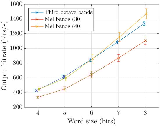 A second set of parameters influences directly the time-frequency resolution of the analysis. By choosing a frame rate and number of bands, one can effectively control the size of the periodically transmitted data. We evaluate the bitrate for 10 to 40 Mel bands and a frame rate from 2 to 10 per second, with fixed . As can be expected, the bitrate for a given word size q can be approximated as a linear function of the representation dimensions for one second of analysis. Small variations are induced by data distributions on a per-frame level and their impact on the Huffman algorithm.