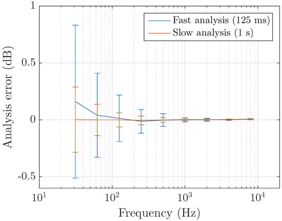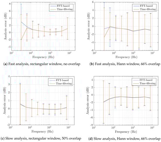 The comparison of the error achieved by the proposed scheme to that of third-octave bands estimated by a reference time-filtering algorithm is now considered. It results in important similarities. For fast measurements and a rectangular window (Figure 10a), a student t-test () shows that the errors are not significantly different between 125 Hz and 12 kHz bands. For the lower frequency bands, the two methods yield different error distributions but of similar importance. Using a Hann window function results in lower error in the low frequency range but adds a bias to the previously accurate band measurements. Again comparing the two computation methods shows a significant difference in the bands below 100 Hz only. A slow analysis results in statistically equivalent errors between the two methods apart from the very low frequencies: with the rectangular window (Figure 10c), at 20 Hz and at 25 Hz for the Hann window and 66% overlap (Figure 10d).
