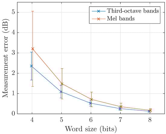 The coder’s output bitrate as well as measurement error is computed for both data representations. This metric is composed of the spectral third-octave band analysis error and the additional loss yielded by quantization before the encoding process.