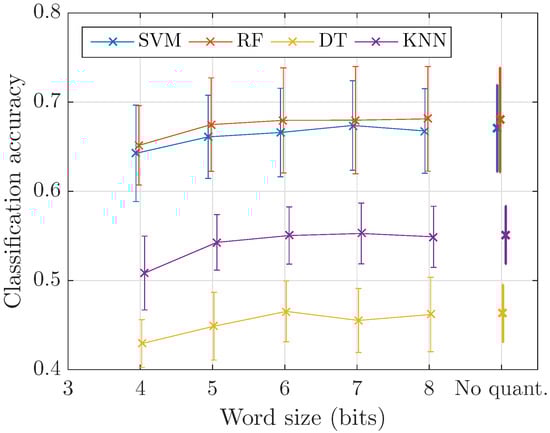 First, we observe the impact of quantization on classification accuracy. The models are trained on the most complete implemented representation to replicate the results of [], i.e., 40 Mel bands, 23.2 ms, 50% overlap analysis and no time averaging (85 frames per second). Figure 12 shows that equivalent accuracies are obtained for all considered values of the quantization parameter q down to 5 bits. The effect of changing the time-frequency resolution of the representation is presented in Table 1. In this table, equivalence of performance with respect to the best performing setting (in red) is depicted with a bold font evaluated using the following procedure. The null hypothesis that the subtraction of the two compared distribution (the distribution of the setting we consider minus the distribution of the best performing one) comes from a normal distribution with mean equal to zero and unknown variance is evaluated using the paired-sample t-test at the 0.05 significance level. If the null hypothesis is not rejected, the setting is considered as equivalent in terms of performance to the best performing one.