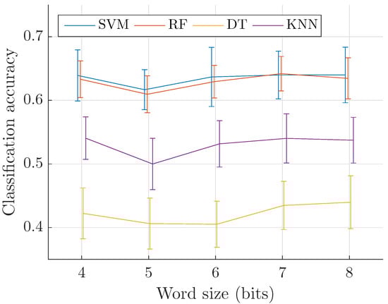 Classification accuracy in percentage for different models: SVMs (a); Random Forests (b); Decision Trees (c); and Nearest Neigbors (d) with respect to varying representation resolutions. Numbers in red indicate best performance and numbers in bold indicate that no statistically significant difference is found when comparing to the best performing setting ().