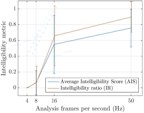 The perceptual test (decoded speech utterances for various conditions can be listened to at https://felixgontier.github.io/cense-coder/) then evaluates the impact of analysis frame rate on intelligibility using the average intelligibility score (AIS) given by the subjects and the intelligibility ratio (IR) computed as the number of correctly transcribed words versus the number of words in the spoken utterance. Given the test conditions presented in Section 3.3 and the number of subjects, the mean and standard deviation are computed on an average of 54 results per frame rate parameter: 12 subjects evaluating each analysis resolution 4.5 times on average.