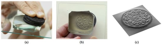 The GelSight sensor was initially designed to measure the 3D shape and texture of the target surface, as firstly introduced by Johnson and Adelson [7]. The device consists of a slab of transparent elastomer covered with a reflective coating membrane. When an object is pressed on the elastomer, the membrane distorts to take on the shape of the object’s surface, but with consistent reflectance. When viewed from behind, the membrane appears as a relief replica of the surface. We place a camera to record the image of this relief, using illumination from light sources at different directions. A photometric stereo algorithm [25] is then used to reconstruct the depth map of surface. Figure 1a,b shows an example of an Oreo cookie being pressed against the elastomer, while the reflective membrane takes on the shape of the Oreo’s surface. We reconstruct the surface from the shaded image, which is rendered in Figure 1c. The spatial resolution of the sensor, when optimized for resolution, can reach 1–2 microns. In the case of compact GelSight devices designed for robot fingers, the spatial resolution is typically in the range of 30–100 microns.