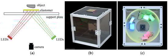 The first GelSight sensor Johnson and Adelson [7] is shown in Figure 2: the sensor is in a shape of a cubic box with the side length of 30 cm, and is made of standard building frames and dark acrylic boards. The sensing elastomer is placed on the top, and the reflective coating of the elastomer is semi-specular, made from bronze flake pigment. The reflective coating has a sharp response to surface textures. A machine vision camera is placed in the bottom. Three LED arrays, covered by the filters of red, green, and blue, are placed under the sensor surface, making the lights illuminate at the elastomer with an angle of 60°. The LEDs have lenses on the top, so that the lights getting out of the LEDs are in small angles. The sensing range of the sensor is about 60 mm × 40 mm, which is only a small part in the central of the sensor’s top surface.