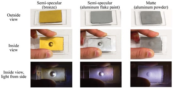 There are three kinds of coating pigments that we use: the bronze flake and aluminum flake for semi-specular coating, and 1 m spherical aluminum powder for matte coating. Examples of the different coatings are shown in Figure 4. The different coatings are good for different applications, and they require different illumination systems. There are two kinds of methods to make the coating: one is using the airbrush to spray the dissolved pigment on the elastomer base, and the other one is to directly brush the pigment powder on the elastomer base.