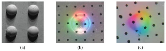 Calibration images (part) with different GelSight sensors. During calibration, a ball/ball array is pressed on the sensor, and the image intensity change corresponds to the surface normal of the ball. (a) the calibration image of the side-illuminated GelSight device [8] (Got copyright permission from Association for Computing Machinery), under the single-colored illumination from one direction; (b) the calibration image of the first fingertip GelSight sensor [28] (Got copyright from MIT), where the illumination has four colors; (c) the calibration image of the improved fingertip GelSight [29] (©2017 IEEE), where the illumination has three colors. For (b,c), we press the ball at different locations, and take the average color change value to surface normal.
