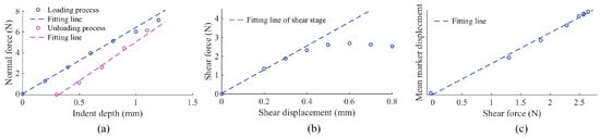(a) when an indenter pressed on the GelSight surface in normal direction, the force is in linear relationship with the indenting depth, but the unloading curve is different from the loading curve due to the viscoelasticity; (b) when an indenter moves on GelSight in the shear direction, the shear force is initially proportional to the shear displacement of the indenter, but then grows slowly and comes to a constant value when partial slip or slip occur; (c) under the shear force, the average marker displacement is proportional to overall shear force, regardless of whether it is in the shear stage or slip stage.