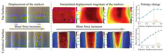Examples of how the displacement field changes as the shear load increases are shown in Figure 8 (experiments done with the fingertip GelSight sensor with flat sensor elastomer piece). The degree of partial slip can be inferred from the inhomogeneity degree of the marker displacement distribution. We use the entropy to describe the inhomogeneity degree of the displacement field. The entropy of a histogram X is
