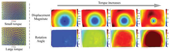 The change of the marker displacement field and rotational angle with the increase of in-plane torque. The contact surface is flat. When the torque grows large, partial rotational slip or full slip occurs, starting from the peripheral area. The partial rotational slip results in the inhomogeneous distribution of the markers’ rotational angle. The experiment is conducted with a fingertip GelSight sensor [30] (Got copyright permission from IEEE) whose surface is flat, and the object in contact is a flat surface.