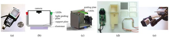The first version is built by Li et al. [30], and is designed for a Baxter Robot gripper (Rethink Robotics, Boston, MA, USA) (Figure 11a,e). The sensor is close to a cubic shape, with the compact size of 35 mm × 35 mm × 60 mm. The design uses perpendicular acrylic plate sets to guide the lights from the top to the sensing elastomer in the bottom, as shown in Figure 11b. The sensing elastomer has semi-specular coating to reveal the details and small fluctuations on the object’s surface. After the internal reflection in the acrylic plate, the lights will be at the angles close to the parallel direction of the elastomer surface. The LEDs on the four sides of the sensors are in the form of a line array (1 × 8), and are of four colors: red (R), green (G), blue (B) and white (RGB). The hue and saturation of each pixel indicates the direction (yaw angle) of the surface normal, since the light sources from different directions are different in color, and the intensity corresponds to the magnitude (pitch of surface normal). The parts of the sensor are displayed in Figure 11d: the support structure is 3D printed with non-transparent materials, which holds the camera and the acrylic guiding plates, as well as providing the mounting structure to the robot gripper. The clear acrylic plates are cut by a laser cutter, and one side is manually ground to 45° to change the light direction. The LEDs are manually soldered into compact arrays, and glued to the top side of the support, just in front of the acrylic guiding plates.