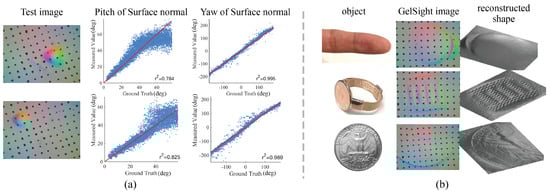 Evaluation on the shape measurement of fingertip GelSight (Figures adapted from [29] (©2017 IEEE)). (a) the measurement of surface normal, when there the sensor is contacting a small ball. The plots compare the measured surface normal value and the ground truth, where the red line marks equal relation. The pitch can be considered as the magnitude of geometry gradient of the contact surface, and the yaw can be considered as the planar direction of the gradient; (b) examples of reconstructed 3D geometry when contacting different objects.