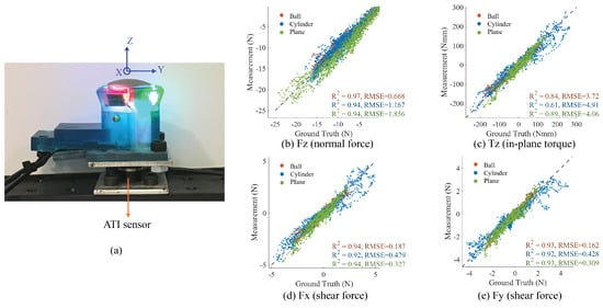 The comparison between the output of the neural network and ground truth from the force/torque sensor is summarized in Figure 14b–e. The coefficient of determination () and root mean square error (RMSE) for the results of three different objects are also listed in the figure. The plots show that the model output of forces and torques by GelSight sensor are correlated to the ground truth measured by the force torque sensor. For the force measurements, is higher than 0.9. The results also show that the GelSight measurement of force can be robust regardless of the geometry of the contact objects.