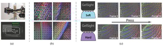 Photometric stereo provides a height map, i.e., it describes the displacement of the membrane surface along the z-axis. During contact, the membrane also moves tangentially. We can measure the tangential displacements (in x and y) by printing markers on the membrane and tracking their displacement over time [26,27]. We paint the black dots, either evenly or arbitrarily distributed, between the elastomer base and the reflective membrane. Their motion in the camera image directly corresponds to the lateral displacement of the elastomer’s surface, and can indicate contact force and torque, as demonstrated in Figure 3b: different kinds of force or torque will make different patterns of motion field, and the magnitude of the marker motion is roughly proportional to the amount of force or torque. The distribution of the marker motion also tells information about slip or incipient slip states.