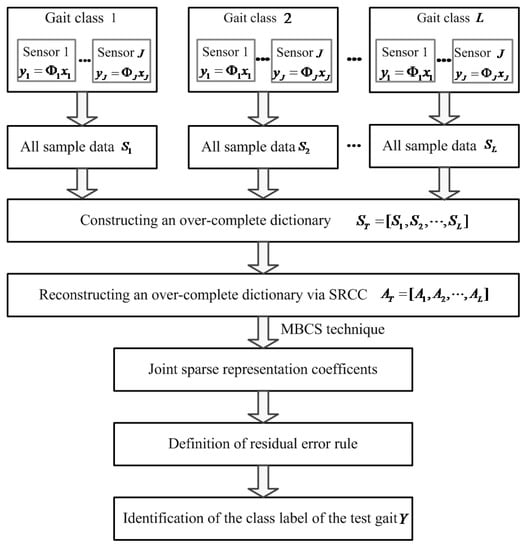 It is well known that multi-sensor gait data generally interact in a complex fashion, an observation attributable to the intrinsic dynamics of human gait. Theoretically, we can assume multi-sensor gait data as a data ensemble with joint sparsity, in order to jointly process multi-sensors and thus capture the higher-correlation information associated with gait. This can potentially allow the best classification performance and energy efficiency of sensors. Recently, there have emerged some advanced techniques that have a superior ability to jointly process multi-signals based on data joint sparsity. Successful examples include distributed compressed sensing (DCS) [,] and the joint sparse representation classification (JSRC) model [,,]. These two techniques have been widely applied in video coding [,,], image fusion [], and multichannel physiological monitoring []. So far, no studies have been reported where DCS and JSRC have been employed for jointly processing multi-sensor gait data.
